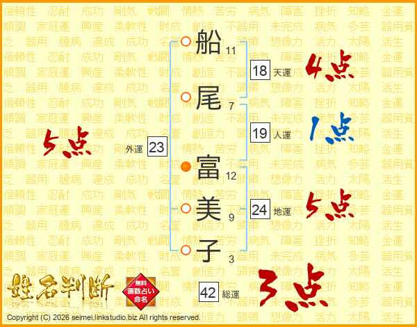 船(11画)尾(7画) 富(12画)美(9画)子(3画)