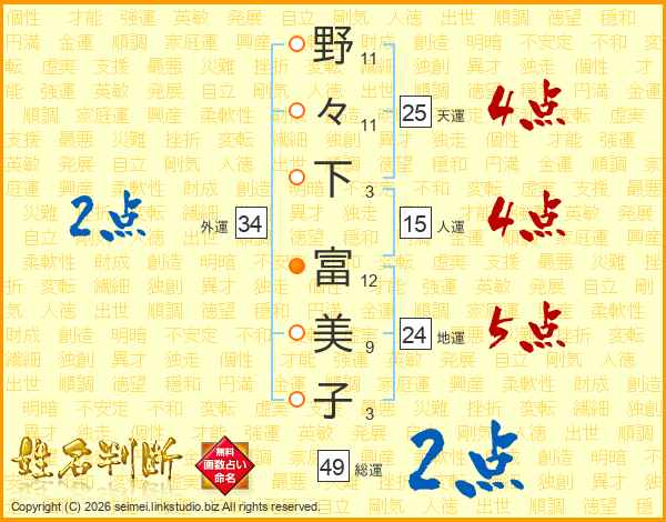 野々下富美子さんの総運は49画の2点!