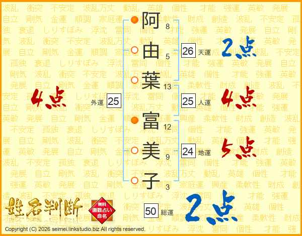 阿(8画)由(5画)葉(13画) 富(12画)美(9画)子(3画)