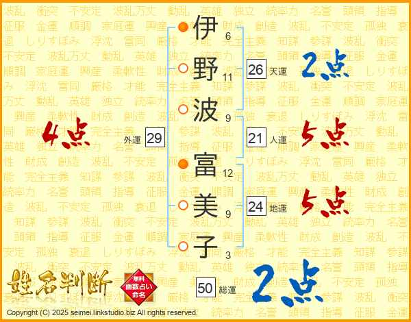 伊(6画)野(11画)波(9画) 富(12画)美(9画)子(3画)