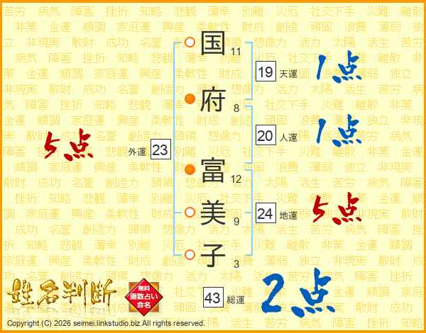 国(11画)府(8画) 富(12画)美(9画)子(3画)