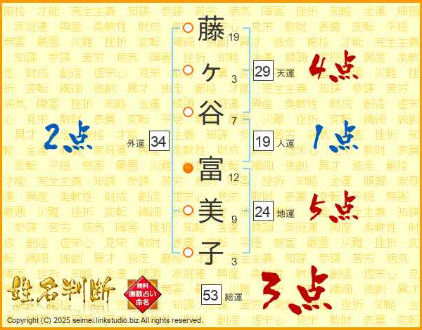 藤(19画)ヶ(3画)谷(7画) 富(12画)美(9画)子(3画)