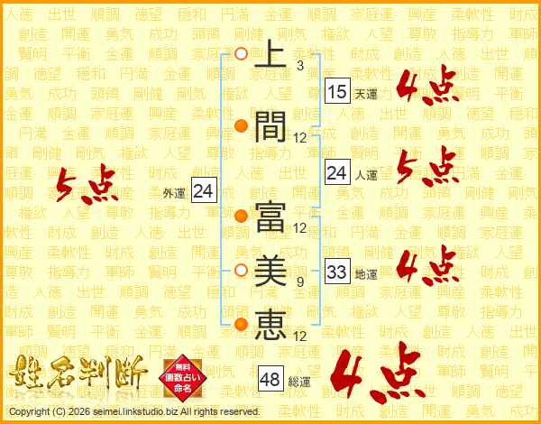 上(3画)間(12画) 富(12画)美(9画)恵(12画)