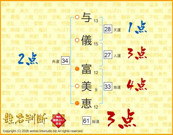 与(13画)儀(15画) 富(12画)美(9画)恵(12画)