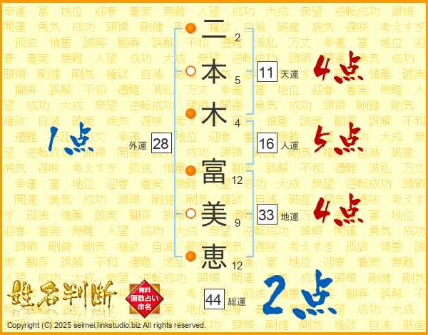 二(2画)本(5画)木(4画) 富(12画)美(9画)恵(12画)