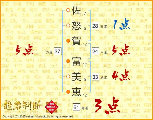 佐(7画)怒(9画)賀(12画) 富(12画)美(9画)恵(12画)