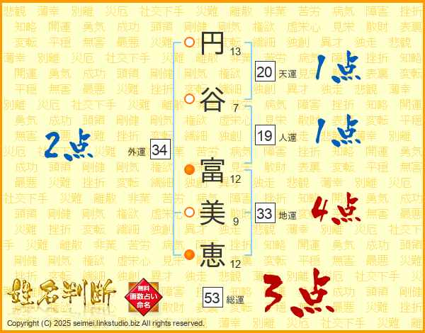 円(13画)谷(7画) 富(12画)美(9画)恵(12画)