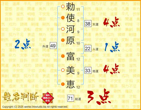 勅(11画)使(8画)河(9画)原(10画) 富(12画)美(9画)恵(12画)