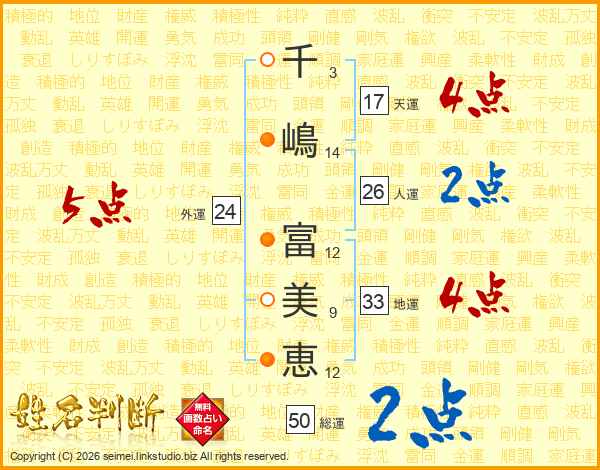 千(3画)嶋(14画) 富(12画)美(9画)恵(12画)