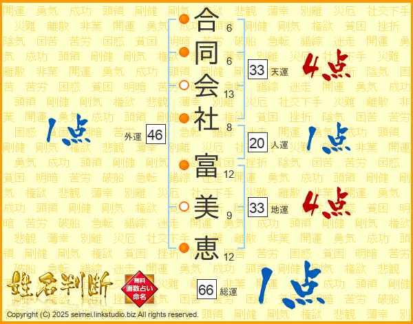 合(6画)同(6画)会(13画)社(8画) 富(12画)美(9画)恵(12画)