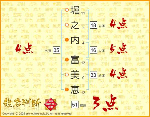 堀(11画)之(3画)内(4画) 富(12画)美(9画)恵(12画)