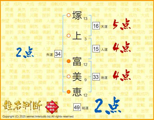塚(13画)上(3画) 富(12画)美(9画)恵(12画)