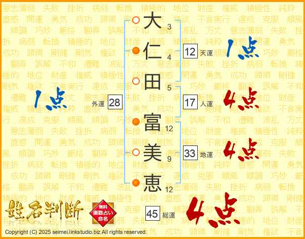 大(3画)仁(4画)田(5画) 富(12画)美(9画)恵(12画)
