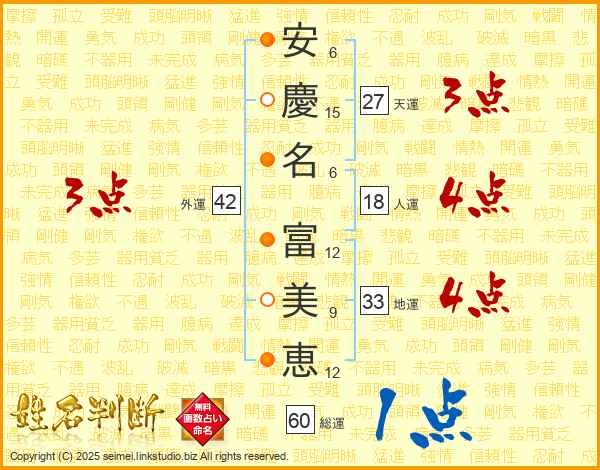 安(6画)慶(15画)名(6画) 富(12画)美(9画)恵(12画)