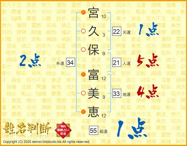 宮久保富美恵さんの人運は21画の5点!