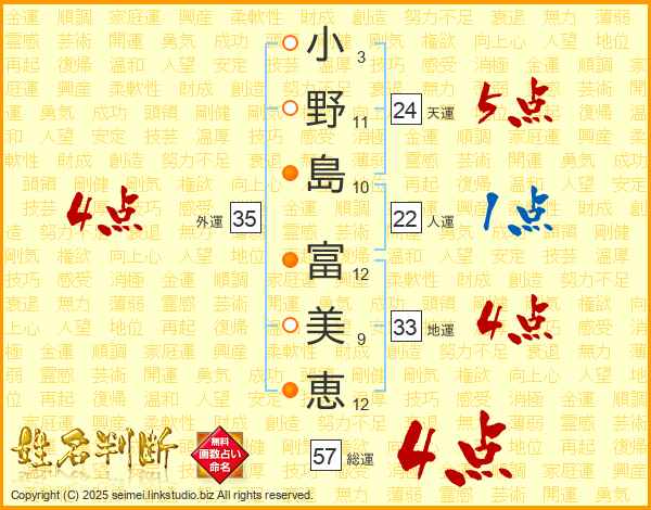 小(3画)野(11画)島(10画) 富(12画)美(9画)恵(12画)