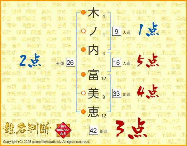 木(4画)ノ(1画)内(4画) 富(12画)美(9画)恵(12画)
