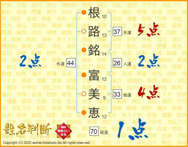 根(10画)路(13画)銘(14画) 富(12画)美(9画)恵(12画)