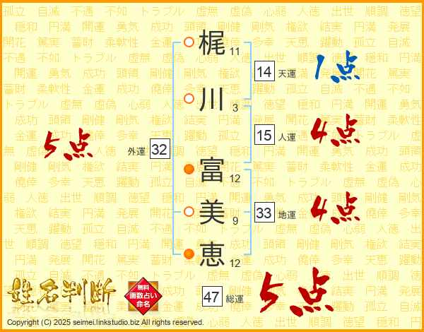 梶(11画)川(3画) 富(12画)美(9画)恵(12画)
