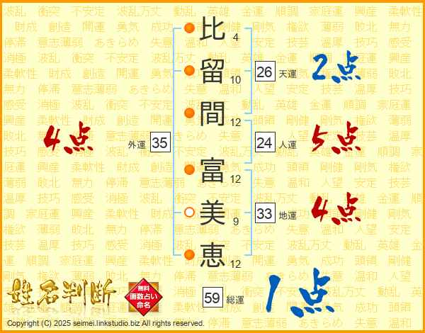 比(4画)留(10画)間(12画) 富(12画)美(9画)恵(12画)