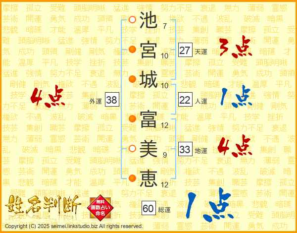 池(7画)宮(10画)城(10画) 富(12画)美(9画)恵(12画)