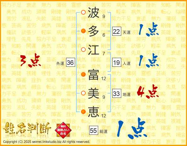 波(9画)多(6画)江(7画) 富(12画)美(9画)恵(12画)
