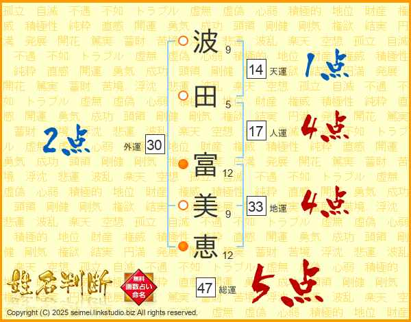 波(9画)田(5画) 富(12画)美(9画)恵(12画)
