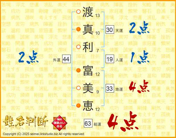 渡(13画)真(10画)利(7画) 富(12画)美(9画)恵(12画)