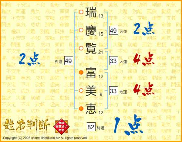 瑞(13画)慶(15画)覧(21画) 富(12画)美(9画)恵(12画)