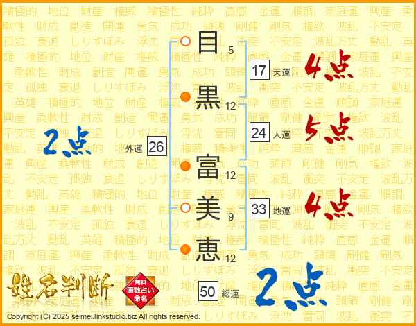 目(5画)黒(12画) 富(12画)美(9画)恵(12画)