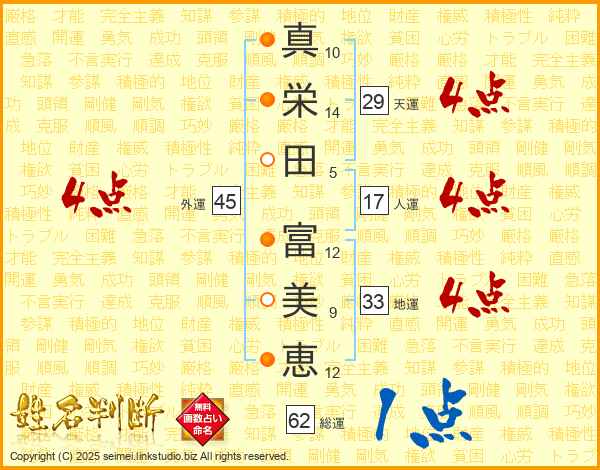 真(10画)栄(14画)田(5画) 富(12画)美(9画)恵(12画)