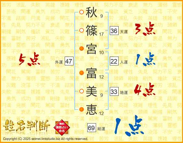 秋(9画)篠(17画)宮(10画) 富(12画)美(9画)恵(12画)