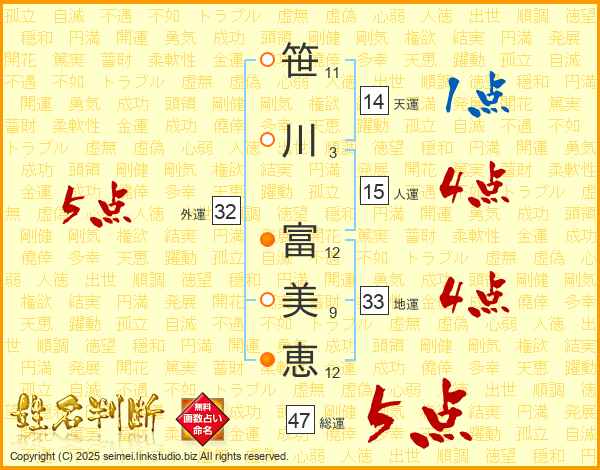笹(11画)川(3画) 富(12画)美(9画)恵(12画)
