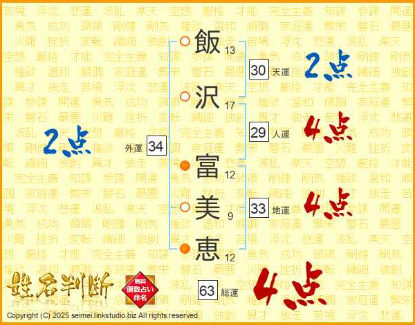 飯(13画)沢(17画) 富(12画)美(9画)恵(12画)