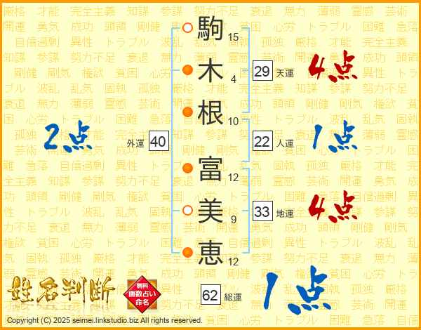 駒(15画)木(4画)根(10画) 富(12画)美(9画)恵(12画)