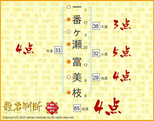 一番ヶ瀬富美枝さんの外運は33画の4点!