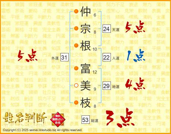 仲(6画)宗(8画)根(10画) 富(12画)美(9画)枝(8画)