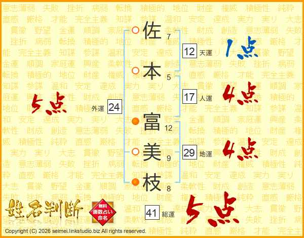 佐(7画)本(5画) 富(12画)美(9画)枝(8画)