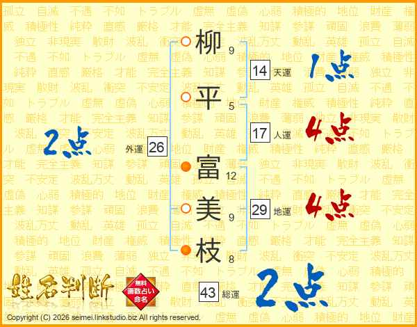 柳(9画)平(5画) 富(12画)美(9画)枝(8画)