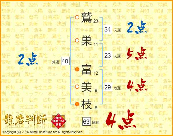 鷲(23画)巣(11画) 富(12画)美(9画)枝(8画)