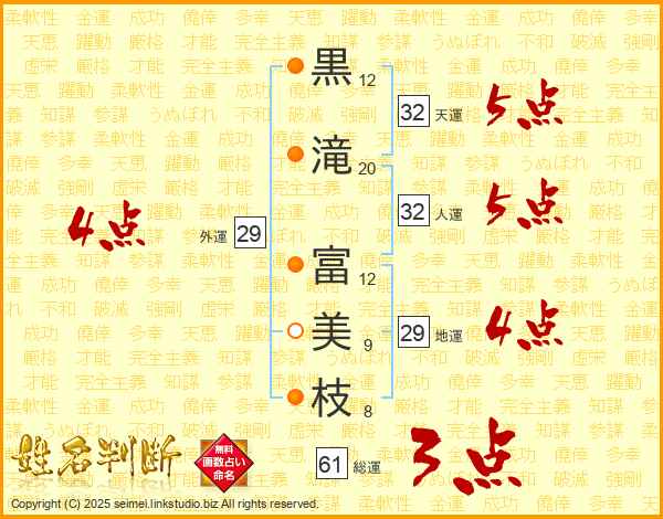 黒(12画)滝(20画) 富(12画)美(9画)枝(8画)