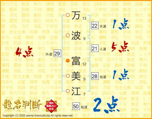 万(13画)波(9画) 富(12画)美(9画)江(7画)