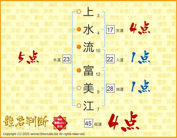 上(3画)水(4画)流(10画) 富(12画)美(9画)江(7画)