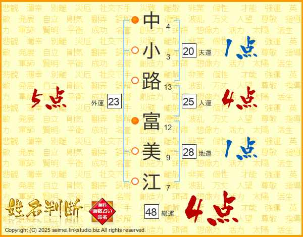 中(4画)小(3画)路(13画) 富(12画)美(9画)江(7画)