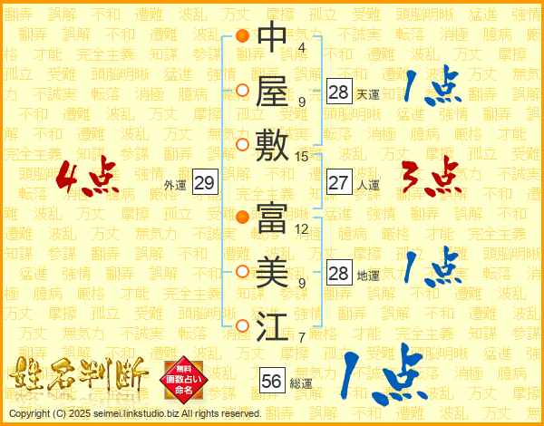 中(4画)屋(9画)敷(15画) 富(12画)美(9画)江(7画)