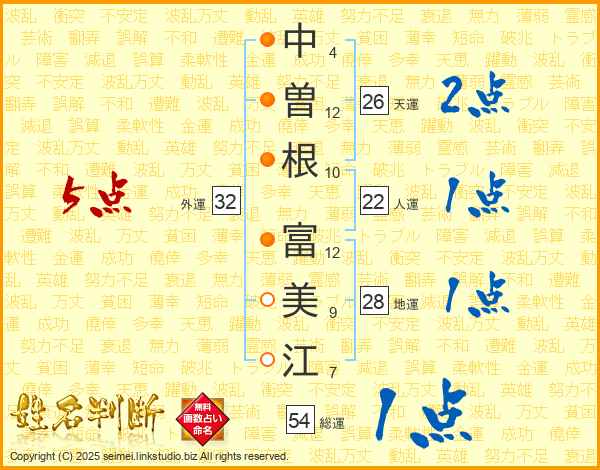 中(4画)曽(12画)根(10画) 富(12画)美(9画)江(7画)