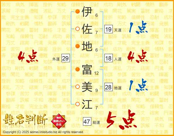 伊(6画)佐(7画)地(6画) 富(12画)美(9画)江(7画)