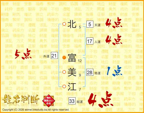 北(5画) 富(12画)美(9画)江(7画)