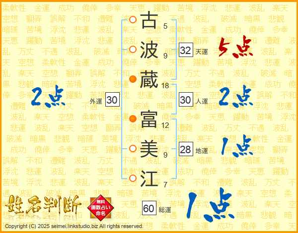 古(5画)波(9画)蔵(18画) 富(12画)美(9画)江(7画)