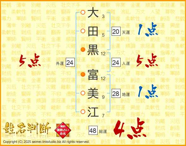 大(3画)田(5画)黒(12画) 富(12画)美(9画)江(7画)